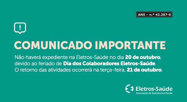 Não haverá expediente na Eletros-Saúde no dia 20 de outubro, devido ao feriado do Dia dos Colaboradores Eletros-Saúde. O retorno das atividades ocorrerá na terça-feira, 21 de outubro.