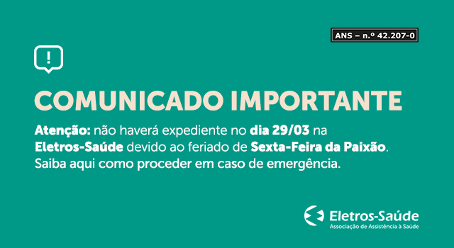 Não haverá expediente na Eletros-Saúde no dia 29 de março devido ao feriado de Sexta-Feira da Paixão. O retorno das atividades ocorrerá na segunda-feira, 1º de abril.