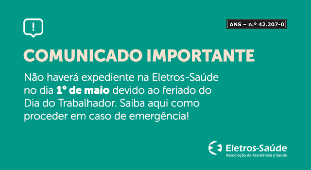 Nesta segunda-feira (01/05), não haverá expediente na Eletros-Saúde devido ao feriado mundial do Dia do Trabalhador. O retorno das atividades ocorrerá na próxima terça-feira, dia 2/05.