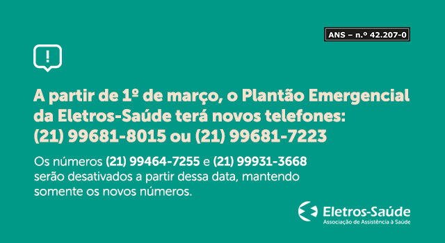 A partir de 1º de março, o Plantão Emergencial da Eletros-Saúde terá novos números para seus beneficiários e credenciados : (21) 99681-8015 ou (21) 99681-7223.