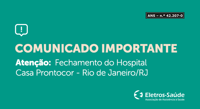 Informamos que o HOSPITAL CASA PRONTOCOR (Pronto Socorro Clínico Prontocor Ltda.), CNPJ 33.134.222/0001-56, localizado à R. São Francisco Xavier, 26 – Tijuca, Rio de Janeiro – RJ, está fechado por tempo indeterminado e sem previsão para reabertura, para reestruturação e modernização das instalações.