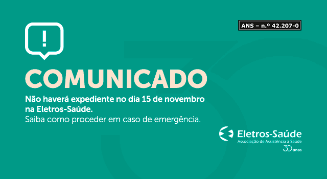 Devido ao feriado de 15 de novembro, em comemoração a Proclamação da República, não haverá expediente na Eletros-Saúde. O retorno das atividades ocorrerá no dia 16, terça-feira. Em caso de emergência neste período, o beneficiário deverá se encaminhar diretamente a um hospital credenciado ou, se preferir, entrar em contato com o Plantão Assistencial da FABES através do telefone (21) 99464-7255 ou (21) 99931-3668 (Linha Adicional).