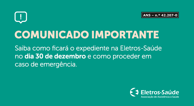 No dia 30 de dezembro (sexta-feira) não haverá expediente na Eletros-Saúde.  O retorno das atividades ocorrerá na segunda-feira, 02 de janeiro.