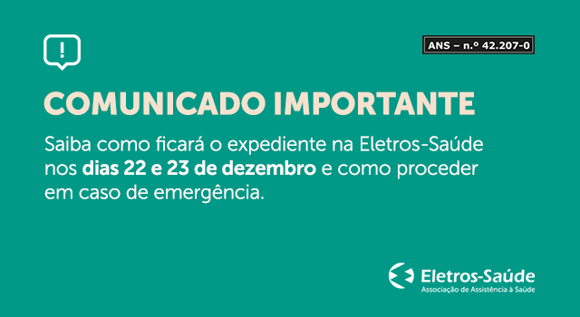 No dia 22 de dezembro (quinta-feira) o expediente na Eletros-Saúde será das 8h às 16h e não haverá expediente no dia 23 de dezembro (sexta-feira). O retorno das atividades ocorrerá na segunda-feira, 26 de dezembro.